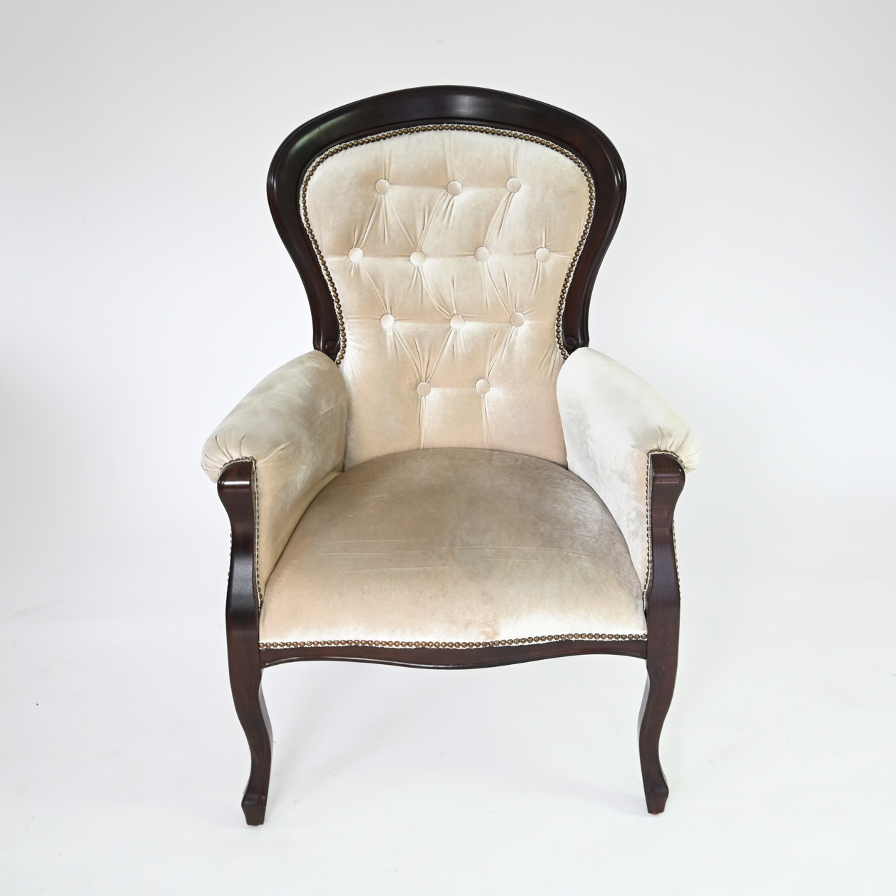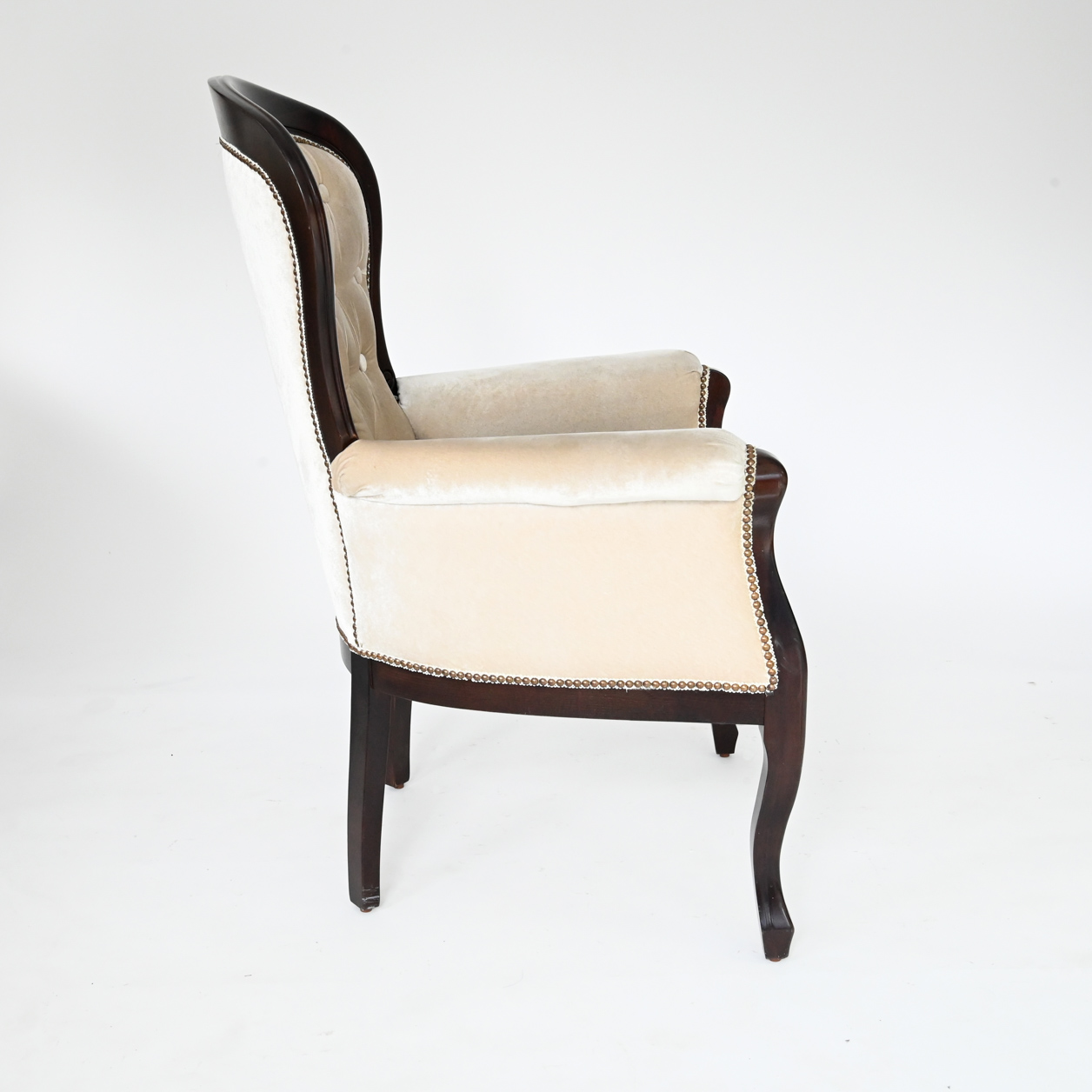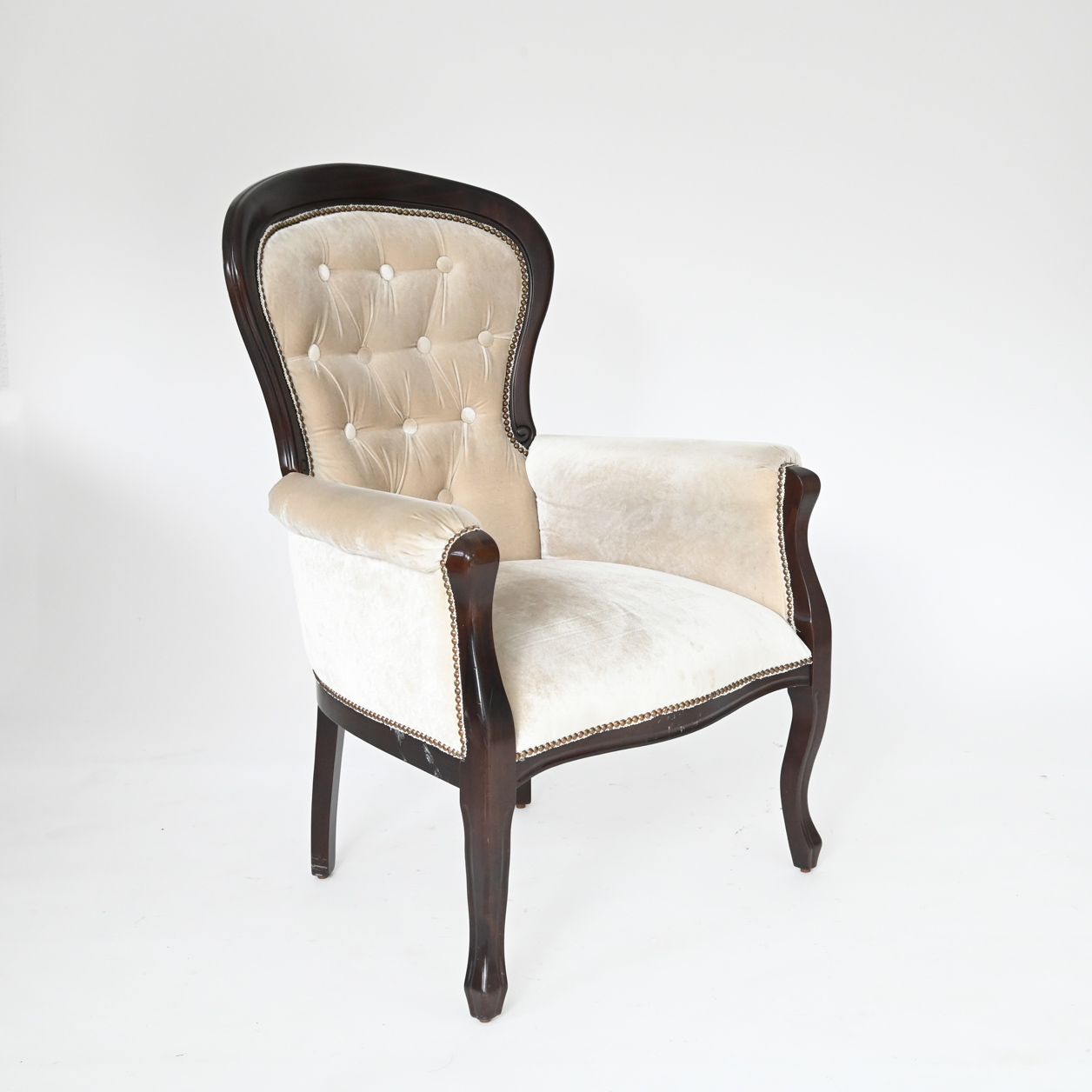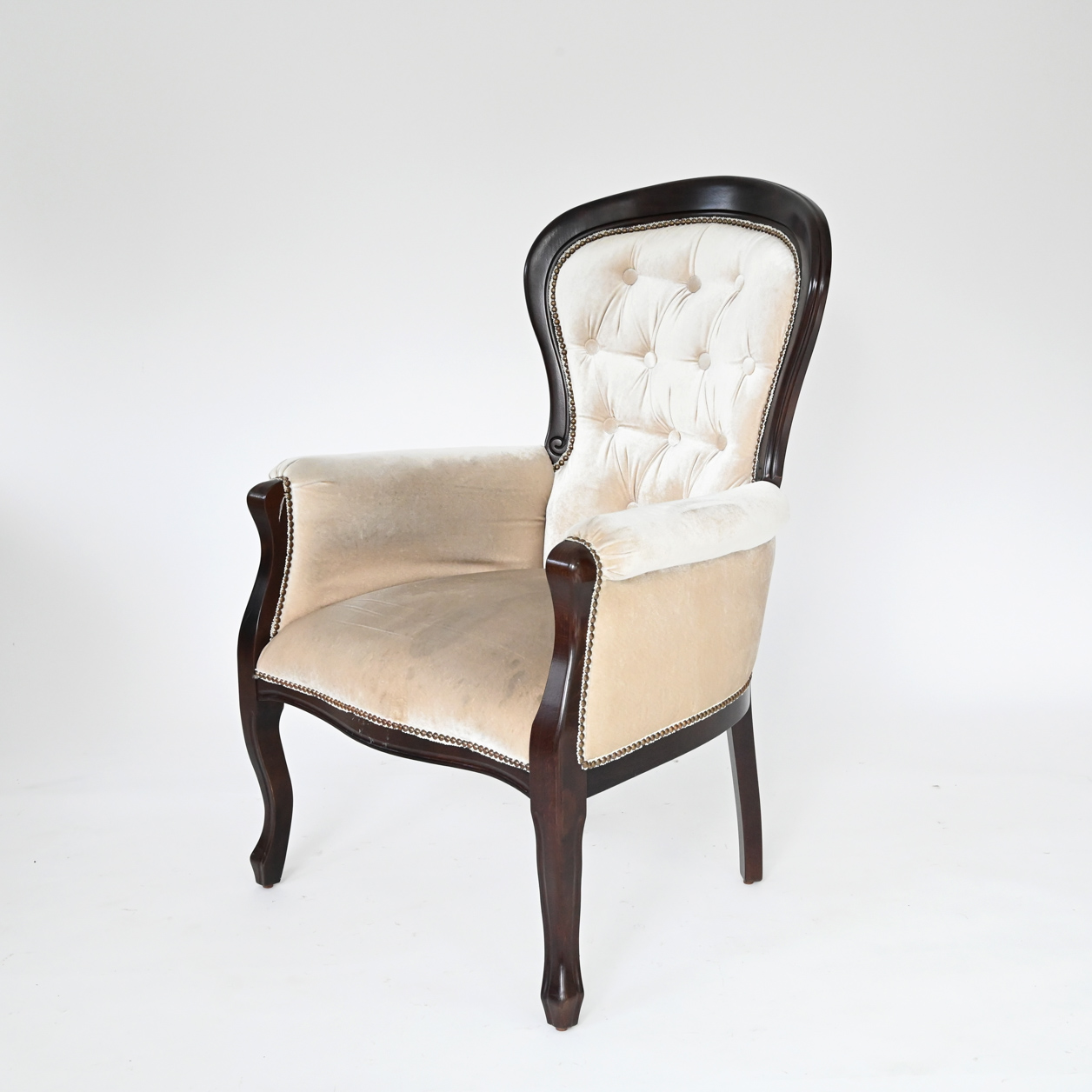 Raspoloživa u bojama bela, vanila, crna, tamni orah, čeri. Mogućnost patiniranja zlatnom i srebrnom patinom. Dimenzije 50x75x102x43x60 (širina sedalnog dela x ukupna širina fotelje x ukupna visina stolice x visina sedalnog dela x dubina
